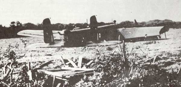 In the early hours of 15th October 1940 the crew on this 58 Squadron Whitley were returning from an operational flight to bomb Stettin when the aircraft ran out of fuel just prior to landing at Driffield. A forced landing was made at 05.10hrs near Harpham, some five miles west of Driffield. As can be seen in the photograph below, the aircraft ran through a hedge and lost part of its starboard wing. The crew escaped injury.