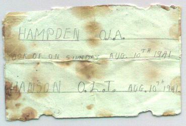 This incident was "witnessed" by a few local people; one of which Mr Ray Magson I spoke to in 2001 who told me that he saw and visited the aircraft. He believed that it landed wheels down and out of fuel, in a ploughed field between the villages of Barton le Street, Slingsby and Butterwick. Unfortunately he did not recall or record the exact date of the landing. The aircraft flew in from the north and landed in a field, he zig-zagged up the small field to apparently slow down, this worked and the aircraft came to a stop in the same field with no damage, the zig-zags were clear visible across the field the following day by local people who came to see the aircraft. The crew must have been collected and returned to their base by road but during the week an RAF tanker came and fuel was put in the aircraft with the hope that it could take off from nearby fields. The Hampden was also towed out of the original ploughed field it had landed in, through a gate and into a grass field next to the field from were it had landed. It was then towed back as far as it could be taken to give it as much room for take-off as possible. A hedge at the far end of the field was taken up to increase the take-off area and the space was made flat. Some large ash trees at the end of the next field which it now was facing may have posed a hazard although they were left. During the whole time the aircraft was in the field a guard was placed on the aircraft but even so local boys managed to get inside the plane and have a look around it. I have been given a piece of the aircraft which was liberated by Ray Magson while it was in the ploughed field and he has also given me the small piece of paper he wrote the aircraft's squadron code. (see below for a scan of it). Sunday, 10th August 1941 came and an Avro Anson landing was attempted bringing aircrew to the field to fly in the Hampden out, this was either on the morning of the flight out or the previous day with the crew staying locally overnight, the Squadron's Anson was landed on this newly created strip successfully. Just after lunch on the Sunday the Hampden's engines were fired up and the aircraft attempted take-off along this runway. A large crowd of locals had gathered to watch, this included many young boys from the area. It was thought that the Hampden would not be able to clear the ash trees at the far end of the strip but it managed with feet to spare. The aircraft then circled around and the crew waved to those on the ground and then flew off. The Anson then took off and also flew away.