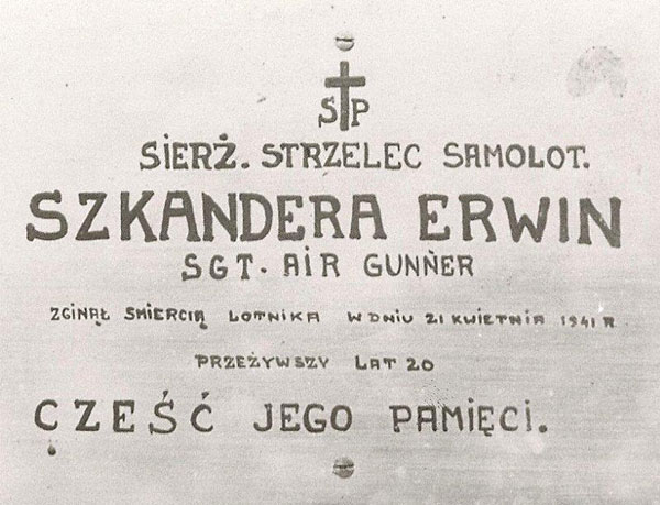 Air Gunner - Sgt Erwin Szkandera PAF (P/780711). Aged 20, of Zevrzydowice, Poland. Died of injuries. Buried St.Edward’s R.C.Churchyard, Clifford, Wetherby, Yorkshire.