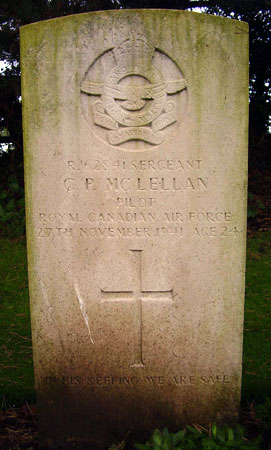 Pilot - Sgt Clement Percival McLellan RCAF (R/62841), aged 24, of Caplan River, Quebec, Canada. Buried Brandesburton Churchyard, Yorkshire.