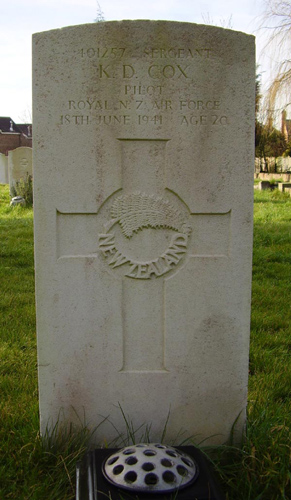 Pilot - Sgt Kevin Desmond Cox RNZAF (NZ401257), aged 20, of Hamilton, Auckland, New Zealand. Buried Leconfield Churchyard, Yorkshire.
