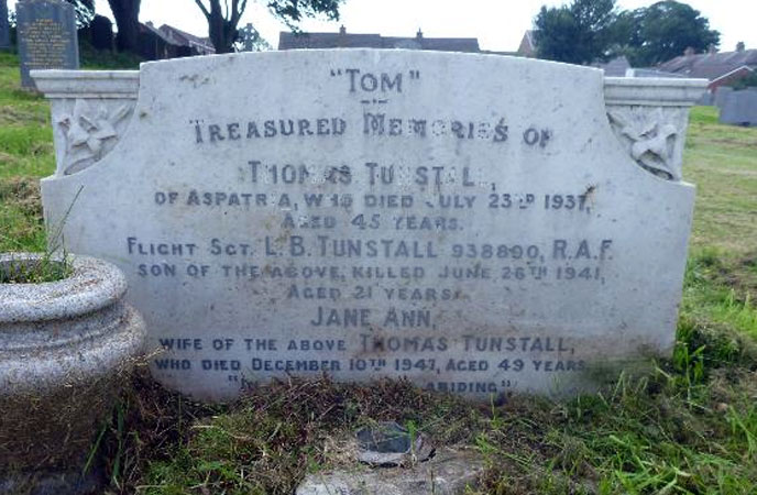 F/Sgt Lewis Tunstall was flying with 19 O.T.U. on 26th June 1941 when Whitley N1379 crashed near Kinloss. He was killed and is buried at Aspatria Churchyard, Cumbria.