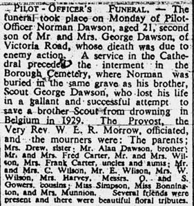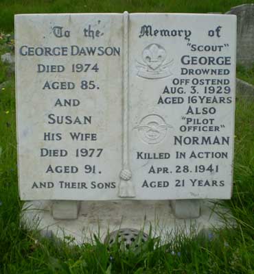 Norman Dawson and the family headstone. Norman received his commission to the rank of P/O on probation on 25th August 1940. His brother George's death was equally tragic. For a period in mid-2007 I was sent to Chelmsford to work and having little to do on an evening set about locating Norman Dawson's grave in Writtle Road Cemetery and researching him the best I could from newspaper archives kept in Chelmsford Library. His grave is not within the main Wargraves plot at the cemetery and on my first two visits I failed to locate it. Walter Cotton RAFVR, killed in the crash of Halifax LL178 near Kepwick, North Yorkshire (detailed on this website), is also buried in this cemetery so these two attempts were not without success; I was able to pay my respects at his grave, that loss I knew well. Norman Dawson was buried with his brother who was sadly killed in 1929.