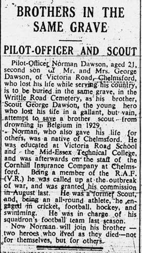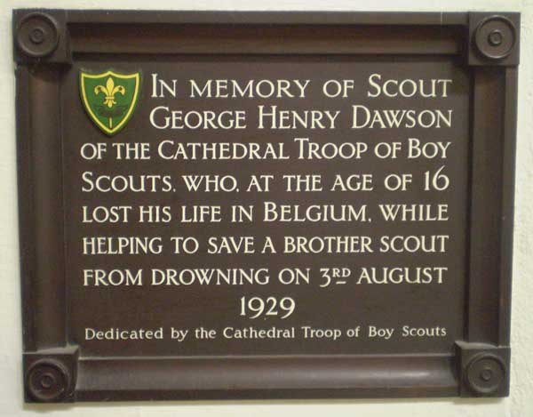Scouts of the 6th Chelmsford (Cathedral) Troop begun their fortnight long summer camp on the 23rd July 1929, the 50 strong troop were camping three miles from Ostend, at Breedene-sur-Mer, in Belgium. On Saturday, 3rd August the troop had just finshed a "bathing parade". At 14.00hrs several Scouts were still paddling at the edge of the sea while two others remained swimming a short distance away - Scouts George Dawson and Stanley Groves. Two older scouts, Chappel and Bayley, were supervising from the shore. From the shore it was seen that Groves had got into diffulties and that Dawson was swimming to his aid, Groves had been hit by a strong wave and was over-come by it. Dawson was able to hold onto Groves and was seen to be lifting him out of the water. The two older scouts saw what was happening and rushed into the sea to assist, Dawson was lifting Groves out of the water and when Chappel and Bayley had swam to them they took Groves, who was by now insensible. Their shouts had also been heard by others on the shore and by now others had entered the water to try and help get those in the water to the shore. A leader and fellow scouts went to help in the water, by now four scouts were seen to be in difficulties, Groves was being held by Bayley at this stage. The second group of rescuers had to drag these four out of the water and all four had to be given mouth to mouth to bring them round. They were taken to a near-by hospital to be seen by a doctor. Because of the intense activity in the water rescuing Groves and three who had assisted in his recsue, the plight of Dawson was not spotted by the second group of rescuers. Twenty minutes later a un-connected visitor to the beach spotted a body floating some distance from the shore, the same Leader Harlow and one of the second wave of recsuers, Scout Haldane, went into the sea and brought Dawson to the shore. Mouth to mouth was tried for half an hour on the beach, and after the doctors arrival artificial respiration was continued for a further three and a half hours, without result in the hospital nearby. It was later stated that Dawson had fainted prior to going under the water, this fainting probably occured because of his initial frantic efforts in holding Groves out of the water. Groves would probably have drowned and Dawsons actions resulted in the life of Groves being saved, to which there is no doubt.