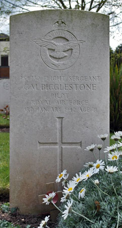 F/Sgt George Bigglestone completed his Tour and was posted to 22 OTU. He died on 3rd January 1942 when Wellington X9640 crashed at Wellesbourne Mountford while flying a training flight. He was twenty one years old and is buried in Stratford on Avon Cemetery, Warwickshire. The photograph of his gravestone shown above was found on "militaryimages.net".
