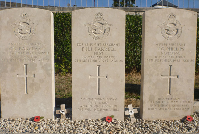 Sgt Farrell was later posted to 102 Squadron and was killed on 9th September 1942 flying Halifax W7677 on Ops to Frankfurt. He is buried in Folschette Churchyard, Luxembourg in a joint grave with two other members of his 102 Squadron crew.