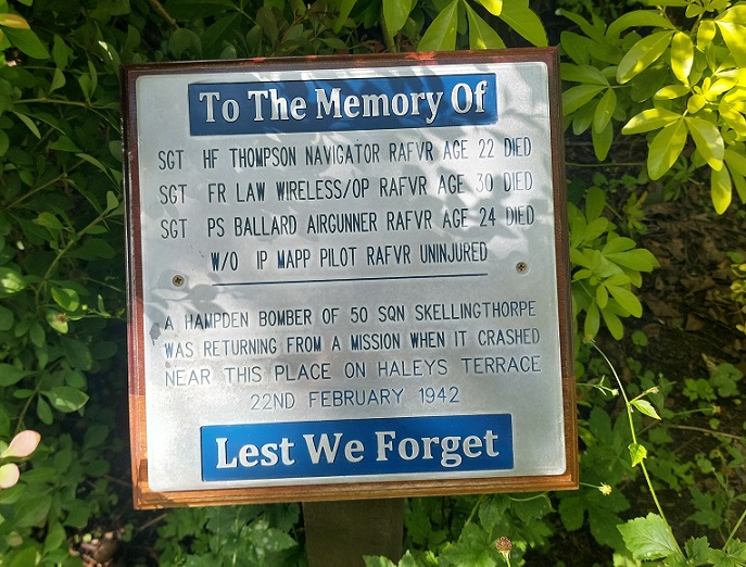 crossing the Yorkshire Coast the aircraft began to ice up. After flying on one engine for some time, with fuel running out and a lack of control of the aircraft the pilot ordered the crew to bail out when the second engine cut out over the York area. Believing that he had allowed time for the others to get clear teh pilot made good his escape and landed safely. Sadly the Hampden's lower escape hatches were jammed shut probably due to the ice formations on the aircraft. Everyone else still in the aircraft were unable to get out of the aircraft before it crashed at 02.18hrs near to the centre of York on a road named Haleys Terrace. The other airman who the pilot saw get clear of the aircraft was also killed when his parachute failed to deploy properly. The pilot was not held responsible. A small memorial plaque was erected close to the crash site in more recent years.