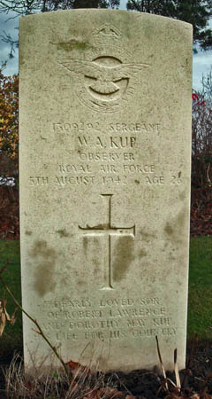 Observer - Sgt Wilfred Anthony Kup RAFVR (1309292), aged 26, of Gerrards Cross, Buckinghamshire. Buried Harrogate Stonefall Cemetery, Yorkshire. B.A.(Oxon.).
