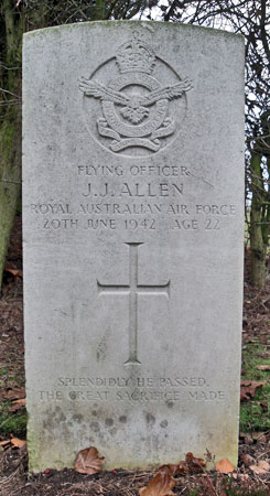 Pilot - F/O John James Allen RAAF (404842), aged 22, of Hughenden, North Queensland, Australia. Buried Holme of Spalding Moor Churchyard, Yorkshire.