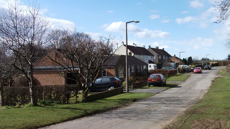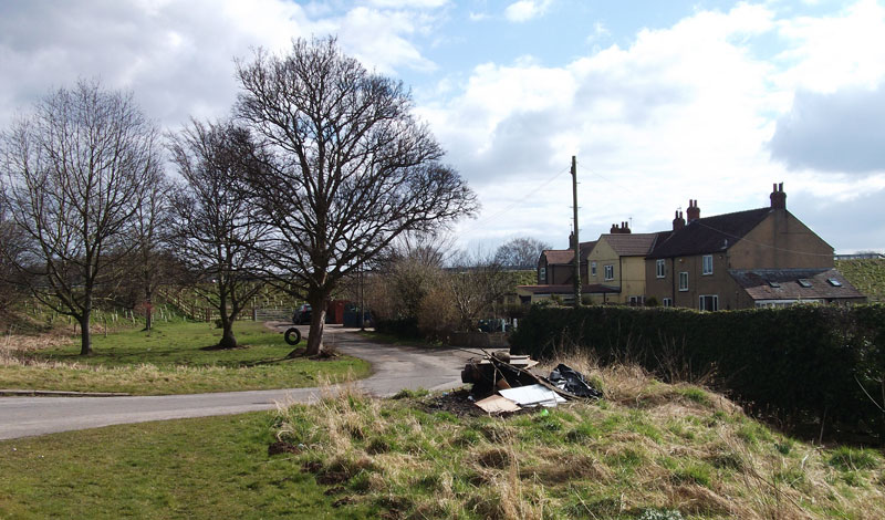 Wellington DF636 flew into this line of houses that has been cut through twice by the main A1 road since the War. The first Leeming by-pass resulted in the loss of some houses and the more modern motorway up-grade saw further houses lost. As young Miss Huggins lived in a house called "Woodside" and there is a wood at the eastern end of Greengate I make the assumption that the aircraft flew into the original houses where the bungalows are now sited, as shown in the photograph above. The photograph below shows the western extent of Greengate.