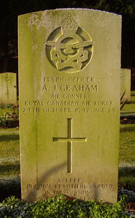 Wireless Operator / Air Gunner - F/Lt Arthur James Graham RCAF (J/5058), aged 23, of Montreal, Quebec, Canada. Buried Barmby Moor Churchyard, Yorkshire. Died of injuries.