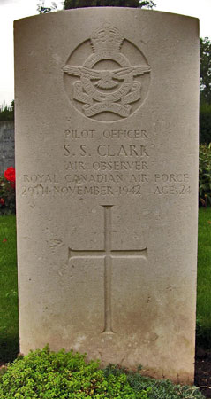 Samuel Clark was born on 10th June 1918 in Webb, Saskatchewan, Canada and was the son of Samuel Stewart and Christina (nee Burns) Clark. He moved to Radisson when he was young and attended school there. Having worked as a teacher from 1937 until 1940 he left his job and began a course at Saskatoon Unversity studying air navigation. He left this course to enlisted into the RCAF in Saskatoon on 2nd May 1941. He was awarded his air observer badge following training in Canada on 14th February 1942. On arrival in the UK he trained at 10 (O)AFU and 22 OTU before posting to 405 Conversion Flight and with the training complete he was posted to 405 Squadron on 20th October 1942. He received a back dated commission after his death to 28th November 1942. The Clark Lake in Saskatchewan is named in P/O Samuel Clark's honour. His brother LAC W C Clark RCAF (R/87227) served in the UK during WW2.