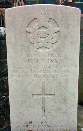 Benjamin Enns was born in Morris, Manitoba, Canada on 8th May 1916 and was the son of David H and Gertrude (nee Penner) Enns. He attended school in Texas and Kansas, USA but returned home to Morris, Manitoba and took over the family farm from his father who died. He enlisted for RCAF service in Winnipeg on 4th March 1941 and trained as a wireless operator / air gunner in Canada, receiving his air gunner's badge and also receiving a commission on 2nd February 1942. On arrival in the UK in May 1942 he trained at No.1 Signal School and 23 OTU before posting to 405 Squadron Conversion Flight (absorbed into 1659 HCU) and posting to 405 Squadron on 14th October 1942. While training at 23 OTU at Pershore he met and married ACW Helen Sandra Hunter (2040208) in September 1942 in Fladbury, Worcestershire. His wife was a native of Airth, Scotland and he was later buried under her arrangements in Airth. His name is also commemorated on the Airth War Memorial (photographs kindly supplied by Sandy Thomson of Airth).