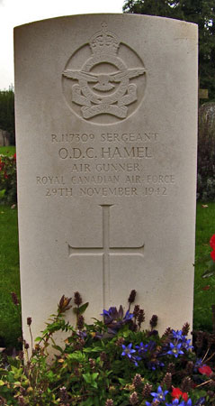 Air Gunner - Sgt Orlando Delmar Conrad Hamel RCAF (R/117309), aged 27, of Sault Ste, Marie, Ontario, Canada. Buried Dishforth Cemetery, Yorkshire.