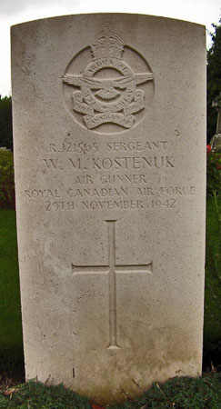Passenger (Air Gunner) - F/Sgt William Michael Kostenuk RCAF (R/121565), aged 19, of Bashaw, Alberta, Canada. Buried Dishforth Cemetery, Yorkshire.