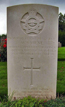 Wireless Operator / Air Gunner - Sgt William Stanley Milne RCAF (R/107580), aged 19, of Regina, Saskatchewan, Canada. Buried Dishforth Cemetery, Yorkshire.
