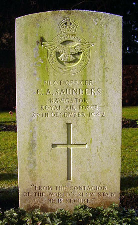 Navigator - P/O Cyril Arthur Saunders RAFVR (130443), aged 34. Wife of Edgbaston, Birmingham. Buried Barmby Moor Churchyard, Yorkshire.