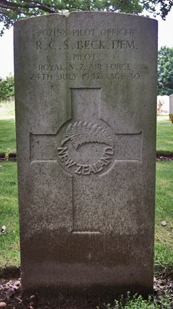 Richard Beck was born on 17th December 1911 in Wesport, Buller, New Zealand and was educated at Westport Technical High School. He was living there and working as a motor mechanic when he was successful in enlisting as a pilot in July 1940 and after training he was awarded his Wings in January 1941 He begun operational training on Hampdens at 16 OTO on 16th April 1941. and was posted to 408 Squadron in July 1941 but was then posted to 49 Squadron, on 29th July 1941. He was reposted back to 408 Squadron on 21st August 1941. He received his commission on 5th February 1942 and was posted to 25 OTU on 7th March 1942 having completed his Tour. He was awarded the DFM for service with 408 Squadron, Gazetted on 13th March 1942. The citation for his DFM reads.. "During his operational tour this airman has carried out some particular find flights. In January 1942 he carried out a successful mine-laying mission off La Rochelle in adverse weather conditions. Afew days previously he had attacked a synthetic rubber factory at Huls. In September 1941 he participated in a daylight raid on Abbeville. On several occasions he has attacked the search light belt near Bocholt, this facilitating the passage of our bombers to their objectives. This airman has set a very fine example."