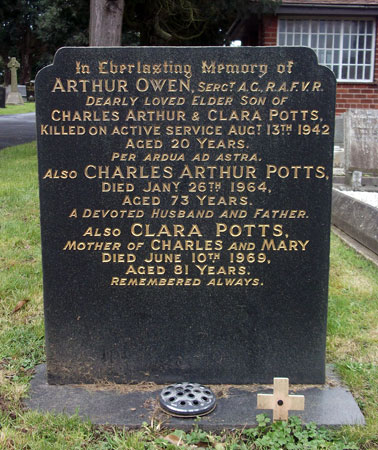 Air Gunner - Sgt Arthur Owen Potts RAFVR (1057542), aged 20, of Hull. Buried Anlaby Tranby Lane Cemetery, Hull, Yorkshire.