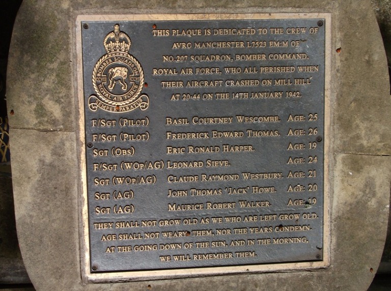 On 14th January 1942 this 207 Squadron aircraft took off from base of Bottesford at 17.35hrs to undertake an operational flight to bomb Hamburg but outbound the aircraft is believed to have suffered a failure of one of the two engines. The crew turned back and had jettisoned the bomb load well before they came in over the Yorkshire coast, the aircraft was seen flying northwards up the Yorkshire coast with its port engine on fire, soon afterwards it crashed into a field at 20.45hrs close to the Yorkshire coast near Cliff House Farm, Holmpton near Withernsea. All on board were killed. A memorial was erected next to Holmpton church in the mid 2000's. Cliff House Farm has since been lost to the sea by coastal errosion.
