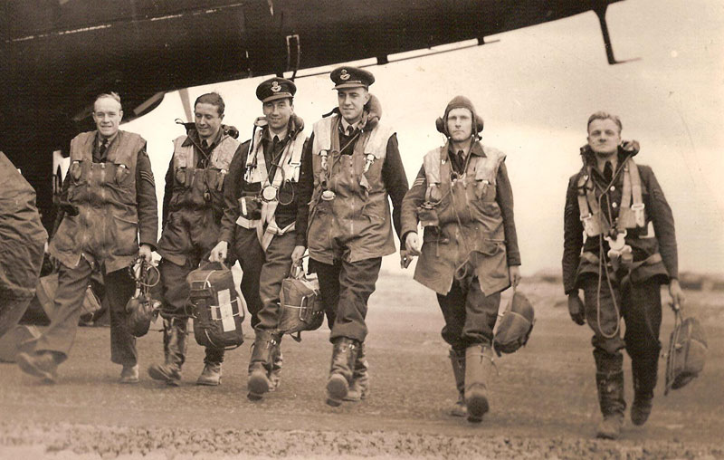 Albert "Jack" Snow is shown third from right on the superb photograph shown above. I thank his nephew Mr Richard Cooper for kindly contacting me and allowing this photograph to appear on this webpage. "Jack" Snow, as he was known, was born in the West Ham area of Essex in 1916. He received his commission to the rank of Acting Pilot before the outbreak of War, he was confirmed in this appointment and graded as Pilot Officer on 27th June 1939 and rose to F/O on 3rd September 1940 and to F/Lt exactly a year later. Technically his rank at the time of this incident was Acting S/Ldr. Sadly Albert Snow was killed on 3rd May 1942 flying with 78 Squadron and is buried in Sage War Cemetery, Germany. The crew listed above were his crew on the night he died and it seems likely that all were with him during his time at 1652 Conversion Unit. Sgt Edwards has no known grave and he is listed on the Runnymede Memorial, he was aged 30. Sgt Mills was 23 years old and Sgt Hebblethwaite was 27 years old, both are buried in Kiel War Cemetery, Germany. P/O Kennedy and Sgt Davies (aged 30) were buried in Sage War Cemetery, Germany.
