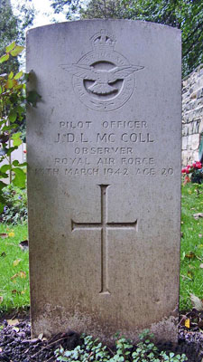 P/O McColl's gravestone at Kirkby Wharfe Cemetery, Yorkshire. He received a commission on 13th September 1941 to P/O on probation (emergency).