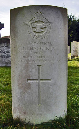 P/O Haggerty's grave in Leconfield churchyard. His birth was registered in Bromley, Kent in 1920 and he received a commission on 7th February 1942 to P/O on probation (emergency).
