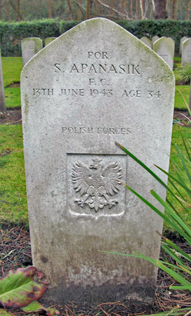 A F/O Stanislaw Apanasik PAF (P/1080) died on 13th June 1943 and he is buried in Brookwood Cemetery, Surrey. He is listed elsewhere on the interent as having died as a result of the injuries sustained some fourteen months earlier but I cannot 100% prove this at the time of creating this webpage. His death is registered in Westminster, London. The "F.C." lettering on his grave would suggest that he was serving with Fighter Command which may rule out him still being with Bomber Command when he died. The photograph of his gravestone was found on "www.findagrave.com" and posted by "Charlie".