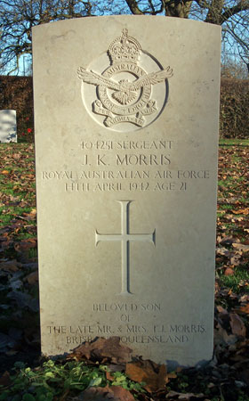 Pilot - Sgt John Kirkpatrick Morris RAAF (404251), aged 21, of Nundah, Queensland, Australia. Buried Harrogate Stonefall Cemetery, Yorkshire.