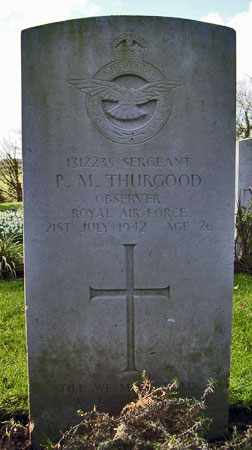 Navigator - Sgt Peter Mitchell Thurgood RAFVR (1312235), aged 26, of Headlington, Oxford. Buried Newton on Ouse Churchyard, Yorkshire.