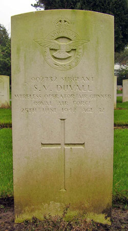 Wireless Operator / Air Gunner - Sgt Stanley Valentine Duvall RAFVR (902732), aged 32, of New Malden, Surrey. Buried Ripon Cemetery, Yorkshire.