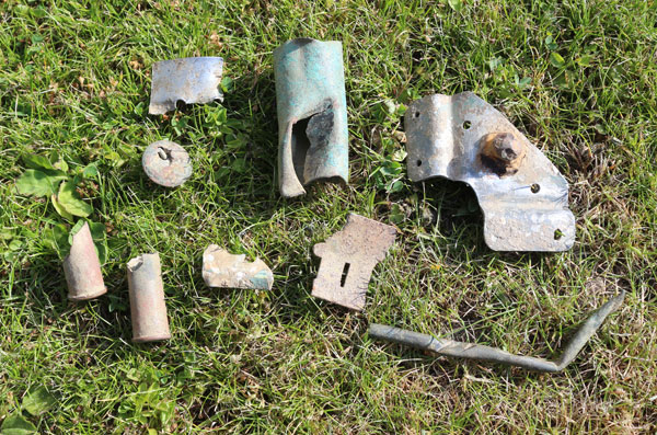 Ken Reast, Albert Pritchard and Eric Barton located small fragments at the crash site in May 1999 with permission from the landowner, this confirmed the site location. Eric retained the items shown in the photograph above.