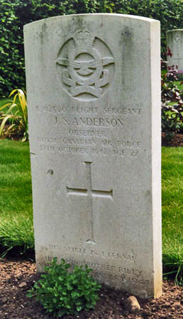 Bomb Aimer - Sgt James Sangster Anderson RCAF (R/92560), aged 22. Died of injuries 17th October 1942. Buried Fulford Cemetery, York.