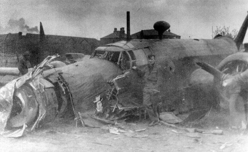 Two photographs of the crashed Wellington X3451 near Askern in May 1942. These photographs originated through the navigator Owen Morgan who was traced by a local man Colin Beetham who had visited the crash site at the time as a young boy and researched the incident and crew in later years. The photograph shown below confirm that the engine nearest the camera must have been the one with the problems as the propeller appears not to have been turning at the time of the crash. The propeller blade at the top is intact and would have broke off had it been rotating. In a letter written by the navigator he stated that the starboard wing caught in some bushes which spun the aircraft around to come to rest where it did, he believed that had this not happened the aircraft would have crashed into the buildings shown behind the aircraft in the photograph above.
