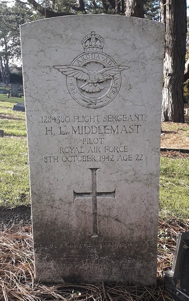 Pilot - F/Sgt Henry Lyons Middlemast RAFVR (1284380), aged 22, of Stanley. Buried Stanley New Cemetery, Durham.