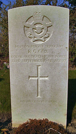 Robert Cox was born on 31st May 1915 in Kogarah, New South Wales and enlisted in Sydney. F/Sgt Cox was killed on 22nd September 1942 while converting to fly in the four engined