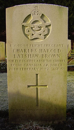 Wireless Operator / Air Gunner - F/Sgt Charles Harold Latshaw Brown RCAF (J/64344), aged 30, of Hamilton, Ontario, Canada. Buried Barmby Moor Churchyard, Yorkshire.