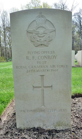 Robert Conroy was born on 14th April 1921 to William Daniel and Bertha Evelyn (nee Tupper) Conroy, of Middle Stewiacke, of Colchester County, Nova Scotia, Canada, and was one of thirteen children. As a young man he worked as a forester in his home town but left to enlist into the Canadian Army in August 1940. He then enlisted into the RCAF on 16th May 1941 in Quebec. After training as a pilot in Canada he was awarded his Pilot's Wings in December 1942. On arrival in the UK in early 1942 he served at No.1 and No.2 Flight Instructor Schools where he qualified as a flying instructor before posting to 15 AFU, 6 (P)AFU and 22 OTU. He was posted to 429 Squadron on 3rd December 1942. Following the crash at East Moor in March 1943 he spent three days at York Military Hospital and was posted back to 429 Squadron. He received a commission on 20th May 1943. After he had recovered from his injuries he would return to flying; he, P/O Densmore (J/17496) and WO Burns (J/144158) were flying together in Wellington HE593 on 12th June 1943 on Ops when the aircraft was shot down over Holland. All but Conroy were killed. Conroy evaded capture and later returned to the UK, via Gibraltar (arriving there on 20th September 1943). He was repatriated to Canada in October, for a period of two months "special leave" and then arrived back in the UK just after New Year 1944. After arriving back in the UK he then trained at 1664 HCU and returned to operational flying with 429 Squadron. Sadly he lost his life on 24th March 1944 after staying with damaged Halifax LV914 which had been damaged by an enemy aircraft; these actions allowed time for his crew to bale out but seriously injured himself he opted to try and crash-land the aircraft near Merbitz, near Halle, Germany. Whilst his crew became PoW, Conroy died before help could reach him and was initially buried locally in the churchyard near the aircraft's crash site. After the War Robert Conroy was re-interred in Berlin War Cemetery. A memorial was erected at the crash site in March 2009.
