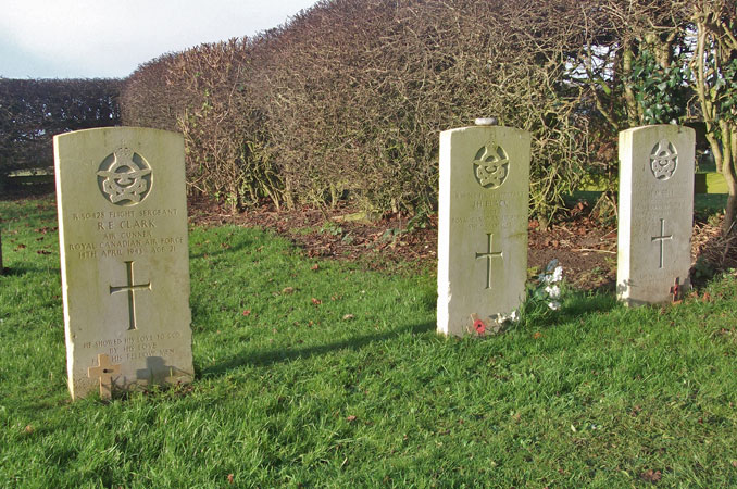 Sgt Ernest Bell was buried in Sutton on the Forest Cemetery with full military honours on 8th March 1943 along with F/Sgt J H Black RCAF (R/118059) who was another East Moor-based airman killed on Ops within days of Sgt Ernest Bell. Their graves are the ones on the right of the group of three. The one on the left is that of F/Sgt R E Clark RCAF (R/50428) killed when Wellington HZ303 crashed into houses in Huntington village in April 1943. These are the only three service graves in the small cemetery and not long after these deaths the RCAF begun to use the larger Harrogate Stonefall Cemetery.