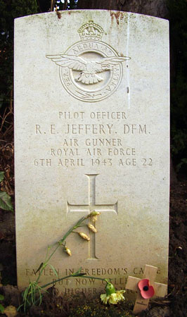 Air Gunner - P/O Ralph Ernest Jeffery DFM RAFVR (142511), aged 22, of Surbiton, Surrey. Buried Driffield Cemetery, Yorkshire.