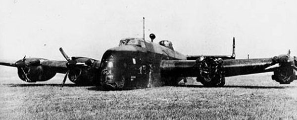 This aircraft took off from Holme on Spalding Moor airfield at 22.16hrs on 25th July 1943 to undertake an operational flight to bomb Essen. While over the target one of the engines suffered problems which resulted in the propeller becoming detached and as it broke free it struck the fuselage. The pilot lost control of the aircraft and instructed the crew to bale out, the mid upper gunner left the aircraft and eventually became a PoW but the pilot then re-gained control before anyone else left. The pilot then withdrew the order to bale out and continued to make the return trip to England. A crash landing was made back at Holme on Spalding Moor at 04.26hrs with the undercarriage up. The photograph above shows the aircraft on its belly after the landing at Holme on Spalding Moor. The pilot and wireless operator were later awarded DFC's for their actions on this night and the joint citation adds more detail, it reads.. "One night in July 1943, these officers were pilot and wireless operator/air gunner respectively of an aircraft detailed to attack Essen. When nearing the target, one of the port propellers was shattered and the engine caught fire. In spite of this, Flight Lieutenant Shannon went on to make a successful bombing run. The wireless apparatus was unserviceable as the aerials had been destroyed but Pilot Officer Ellis resourcefully erected an emergency aerial and thus was enabled to re-establish contact with base and obtain bearings which proved of material assistance to his pilot on the return flight. Both these officers displayed great skill and tenacity, setting an excellent example.