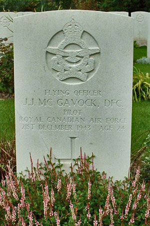 John McGavock was born on 14th March 1919 at Winnipeg, Manitoba, Canada and was the son of Frank and Theresa (nee Forsythe) McGavock. After leaving high school John attended business college before starting work as an office clerk for a company in Winnipeg. He enlisted for RCAF service 4th June 1941 in Winnipeg for aircrew duties and trained as a pilot, receiving his pilot's flying badge on 13th March 1942. On arrival in the UK he trained at 12 (P)AFU and 22 OTU before posting to 426 squadron on 28th October 1942 who were flying Wellingtons at the time. He received a commission on 6th March 1943. 426 Squadron converted to Wellingtons and his service file state he converted at 1678 Conversion Flight (though 1679) was more common for No.6 Group airmen). For service with 426 Squadron he was awarded the DFC, Gazetted on 15th June 1943. The citation for his award reads.. "This officer has taken part in numerous attacks against all types of enemy targets including such heavily defended areas as Hamburg, Mannheim, Essen and Cologne. He has also participated in several mine-laying operations. Pilot Officer McGavock's quiet determination to complete his allotted tasks, regardless of adverse weather or enemy opposition, has proved him to be an outstanding captain of aircraft who inspires the utmost confidence in his crew."