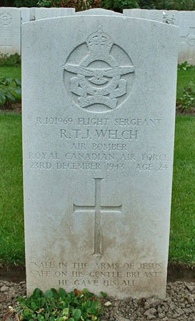 Bomb Aimer - F/Sgt Robert Thomas James Welch RCAF (R/101969), aged 24, of Boissevain, Manitoba, Canada. Died of injuries on 23/12/1943. Buried Harrogate Stonefall Cemetery, Yorkshire (C/H/7).