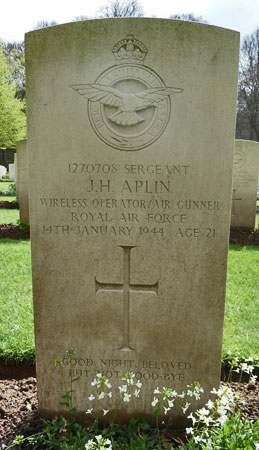 All of those named above, excepting Sgt Dickinson, were on board Lancaster DS850 on 14th January 1944 on Ops when it was hit by incendiary bombs from above which holed the aircraft's fueltanks. Realising the situation the pilot ordered the crew to bale out, two of the crew were killed including Sgt Aplin who is buried in Reichswald Forest War Cemetery who was twenty one years old. The rest of the crew survived but became PoW's. My thanks to Mr Graham Sharpe for the photograph of Sgt Aplin's gravestone.