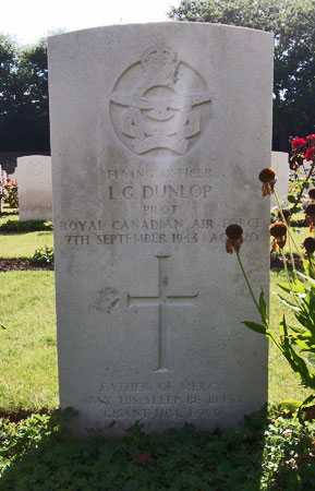 Pilot - F/O Lawrence Gay Dunlop RCAF (J/20568), aged 20, of Mayenod, Saskatchewan, Canada. Buried Harrogate Stonefall Cemetery, Yorkshire (C/B/15).
