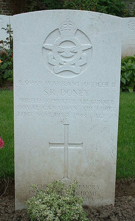 Wireless Operator / Air Gunner - F/Sgt Sydney Robert Doney RCAF (R/59859), aged 22, of Winnipeg, Manitoba, Canada. Buried Harrogate Stonefall Cemetery, Yorkshire (C.E.5).