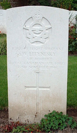 Bomb Aimer - Sgt Stephen Williams Litynesky RCAF (R/157050), aged 27, of Ashville, Manitoba, Canada. Buried Harrogate Stonefall Cemetery, Yorkshire (C.E.4).