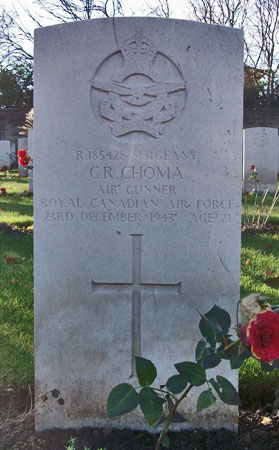 Rear Gunner - Sgt Constantin Robert Choma RCAF (R/185428), aged 21, of Montreal, Province of Quebec, Canada. Buried Harrogate Stonefall Cemetery, Yorkshire (C/H/8).