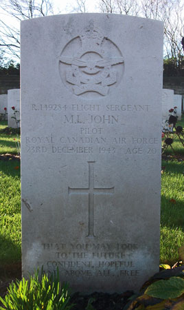Pilot - F/Sgt Merlin Lindsay John RCAF (R/149284), aged 20, of Salmo, British Columbia, Canada. Buried Harrogate Stonefall Cemetery, Yorkshire (C/H/9).