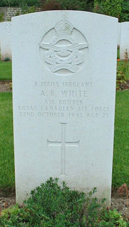 Bomb Aimer - Sgt Ashley Bertram White RCAF (R/158113), aged 25, of North Battleford, Saskatchewan, Canada. Harrogate Stonefall Cemetery, Yorkshire (C/D/3).